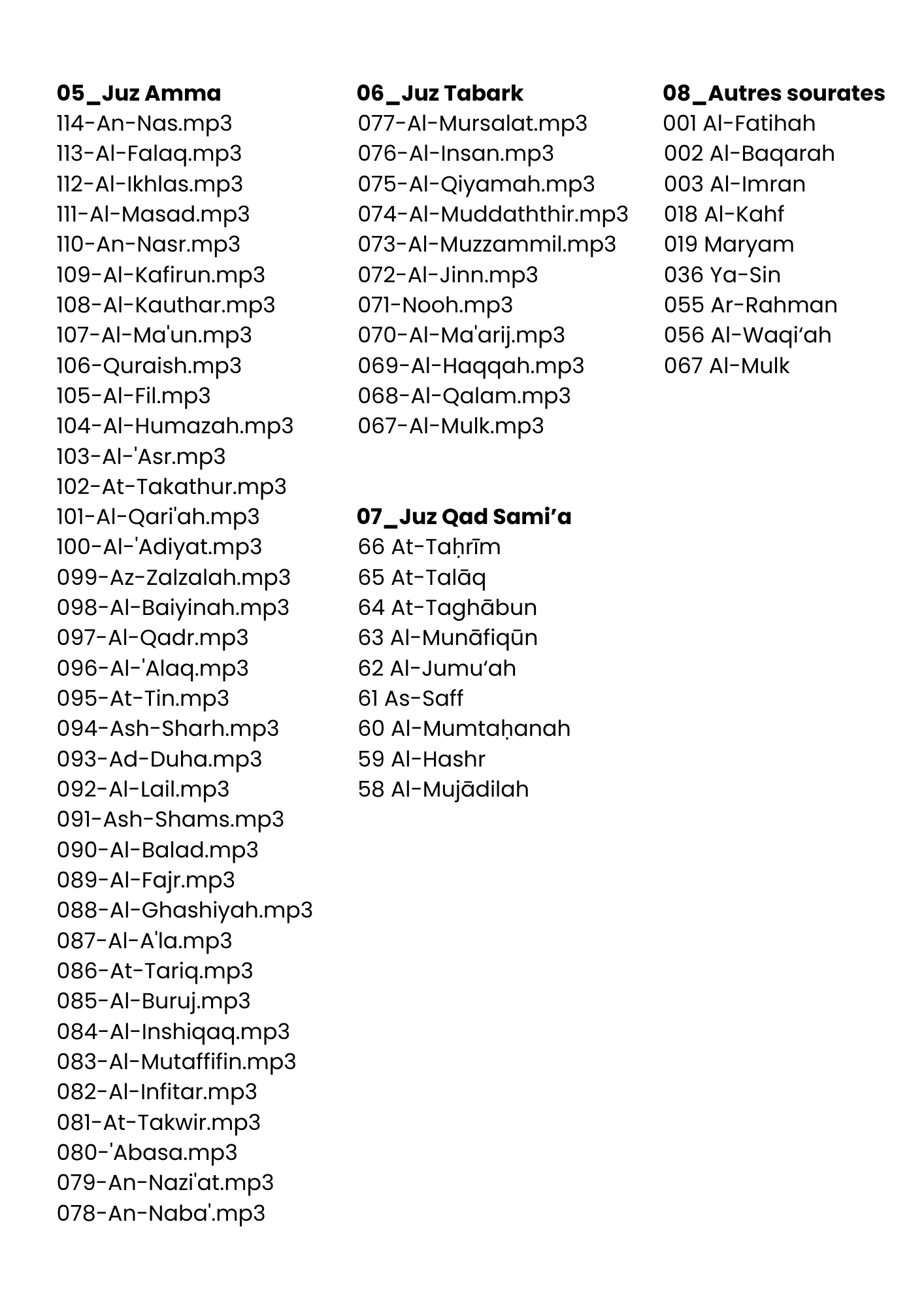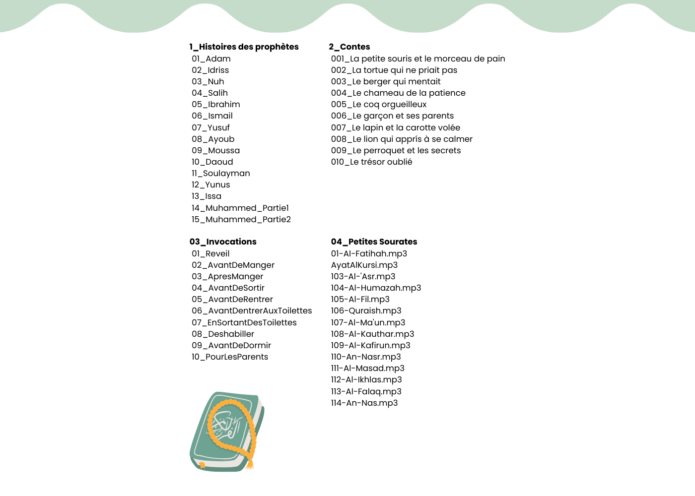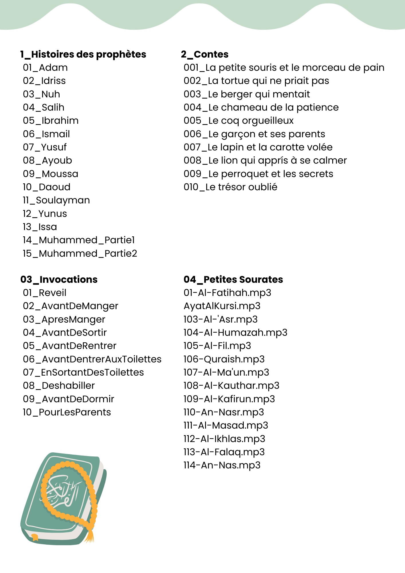 Le Petit Hafiz est organisé sous forme de répertoires contenant les différentes sourates, histoires, contes et invocations. Chaque répertoire regroupe les fichiers audios correspondants, classés de manière simple et claire pour faciliter l’apprentissage et l’écoute.