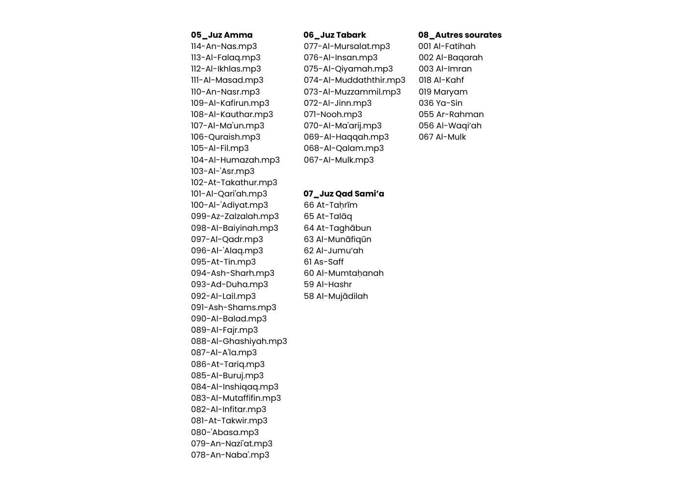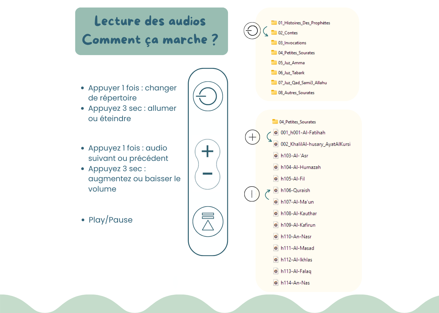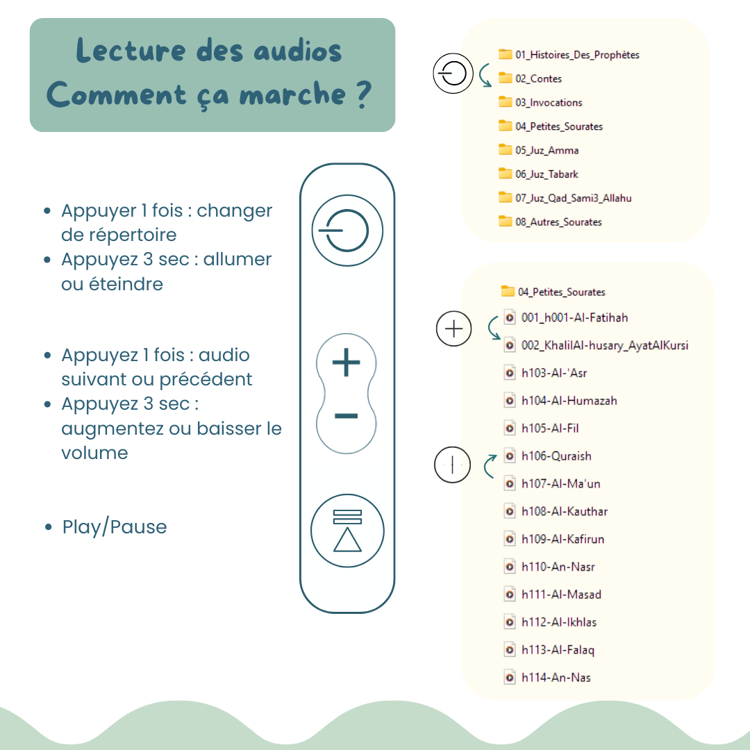 Le Petit Hafiz est organisé sous forme de répertoires contenant les différentes sourates, histoires, contes et invocations. Chaque répertoire regroupe les fichiers audios correspondants, classés de manière simple et claire pour faciliter l’apprentissage et l’écoute.